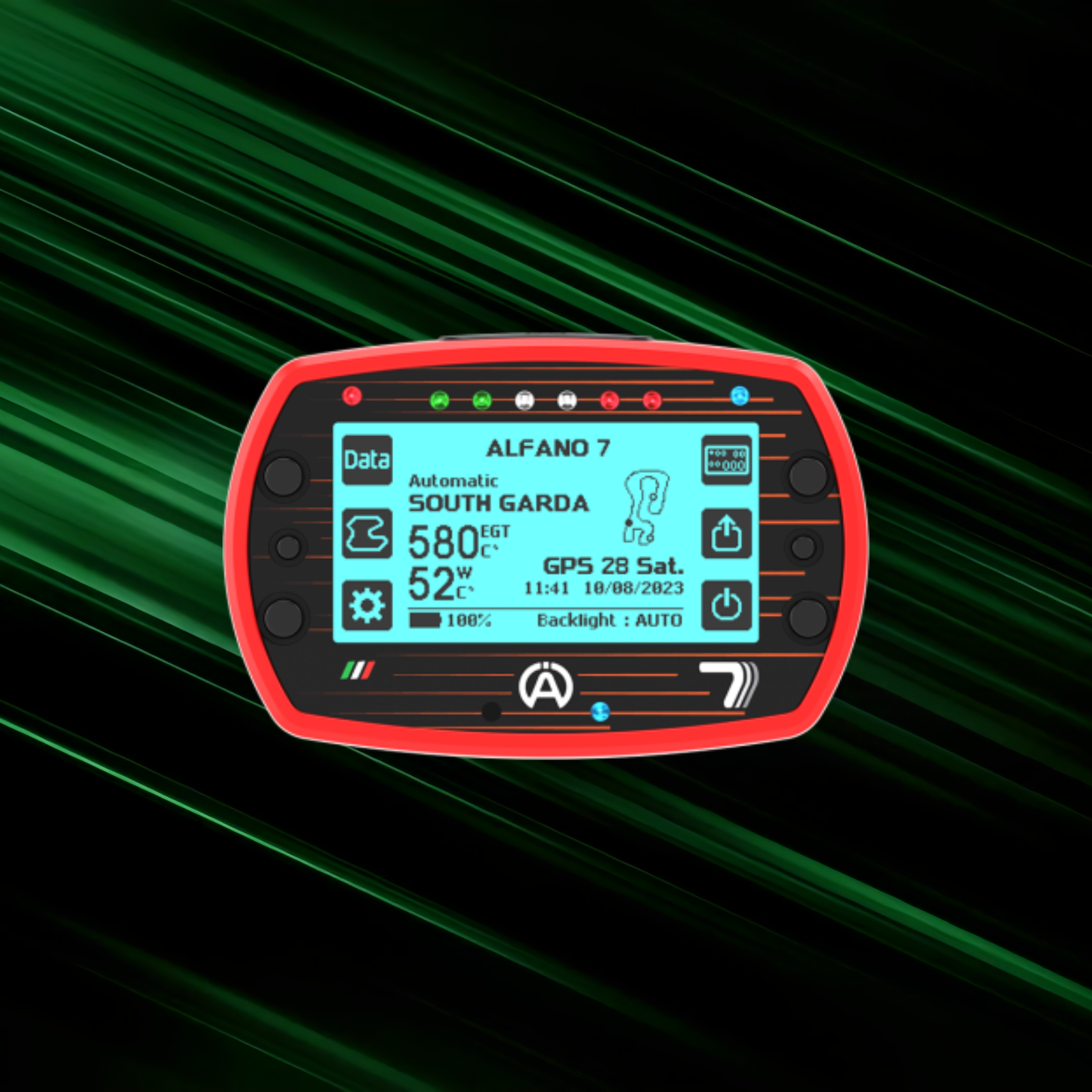 Der ALFANO 7 verfügt nun über ein 25Hz-GPS, das 2,5-mal schneller ist als das Vorgängermodell ALFANO 6, wodurch die Genauigkeit der Zeit- und Kursangaben verbessert wird. Außerdem verfügt der ALFANO 7 über eine drahtlose Kommunikation (Wireless), die Ihnen unzählige Möglichkeiten bietet. Die Sensoren kommunizieren direkt mit dem ALFANO 7, was eine sehr einfache Installation bedeutet, da keine Kabel oder Zwischenboxen benötigt werden. Dank der Wireless-Technologie konnten wir Sensoren entwickeln, die den Druck und die Temperatur im Inneren der Reifen messen können. Außerdem haben wir Wireless-Infrarotsensoren entwickelt, die die Temperaturen auf der Reifenoberfläche messen können. Mithilfe unseres USB, Wireless Dongles, der mit einem PC verbunden ist und in Kürze erhältlich sein wird, kann der ALFANO 7 diese Daten weiter und schneller übertragen - +/- 5 Mal schneller als Bluetooth.