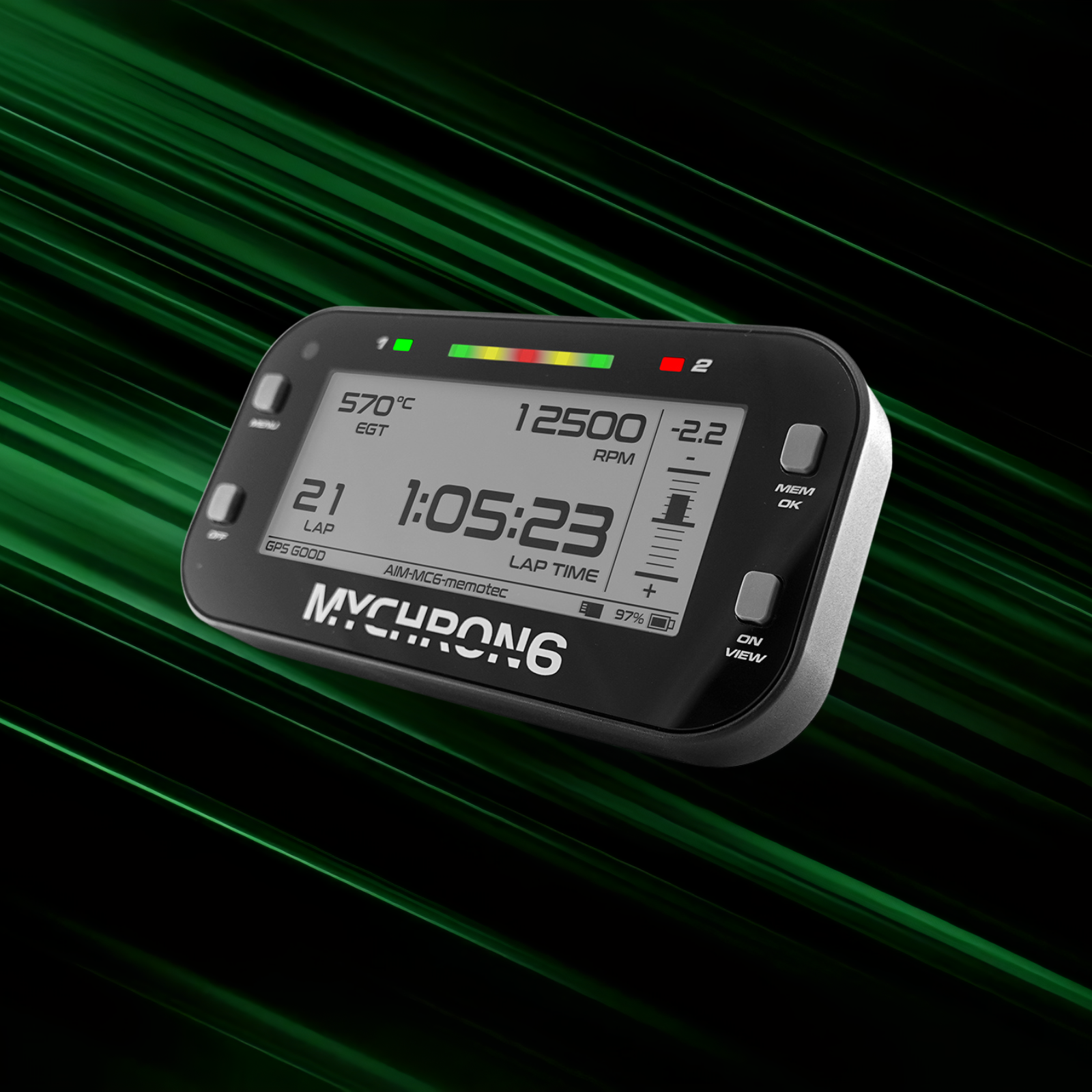 AiM MyChron6 hat ein 25Hz GPS-Modul, eine höhere Prozessorleistung und ein neues WiFi-Modul, wodurch die Datenübertragung wesentlich schneller als beim Mychron5s ist. Es besitzt ein hochauflösendes Grafikdisplay zur Anzeige von Drehzahl, Geschwindigkeit, Rundenzeiten, Gang, Temperatur (eine bzw. zwei beim MC6 2T), Satellitenempfang und der Daten der angeschlossenen Erweiterungen wie Lambda oder MyChron Expansion. Es können mehrere Displayseiten frei konfiguriert und über die 4 Taster ausgewählt werden. Die Display-Beleuchtung kann in 7 verschiedenen Farben eingestellt werden und die Helligkeit steuert ein Lichtsensor.