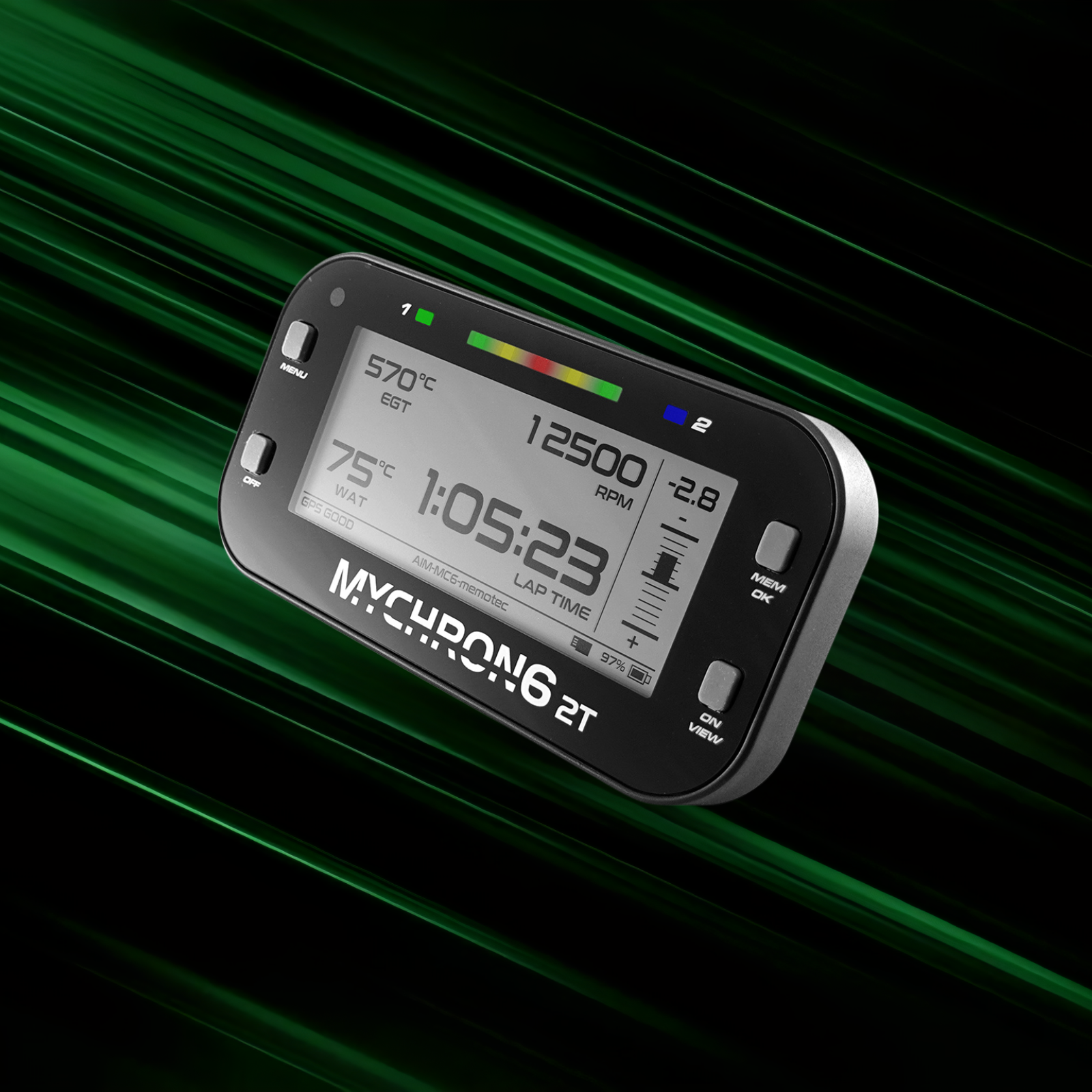 Das AiM MyChron6 2T hat ein 25Hz GPS-Modul,eine höhere Prozessorleistung und ein neues WiFi-Modul, wodurch die Datenübertragung wesentlich schneller als beim MyChron5S ist. Es besitzt ein hochauflösendes Grafikdisplay zur Anzeige von Drehzahl, Geschwindigkeit, Rundenzeiten, Gang, Temperatur (eine bzw. zwei beim MC6 2T), Satellitenempfang und der Daten der angeschlossenen Erweiterungen wie Lambda oder MyChron Expansion.